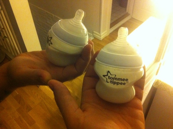 Den här flaskan ska vara designad för att simulera ett riktigt kvinnobröst. Den måste man ha. Sen måste man ha den innovativa baksugsflaskan som gör att det inte kommer ner luft i magen. Fast den läcker som ett soll. Och ut över dem måste man tydligen ha fötti-föttifem andra nappflaskor med. Jag tror att man måste köpa en ny varje gång man handlar faktiskt.