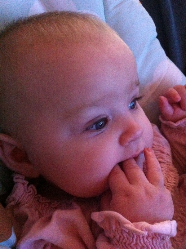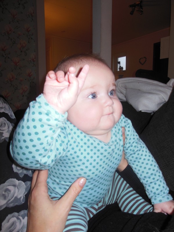 Du är nästan sex månader gammal nu, på måndag mer exakt. Du sitter stadigt i barnstolen eller i soffan, men man kan inte lämna dig sittande på golvet, även om du kan, för ser du något roligt så försöker du greppa det och faller handlöst. Men bullar man upp med kuddbarrikader så. Du äter det mesta, varvar med nappflaskan. Fortfarande bara två gaddar, nedre framtänderna, men de har vuxit sig stora. Eller, ja, de syns nu, och känns. Du ”pratar” mycket, och så pruttar du med munnen, en ny grej du börjat med nyligen. Lägger man dig på rygg så välter du över på sidan, men inte helt till mage. Du har snurrat runt helt en enda gång, på skötbordet.