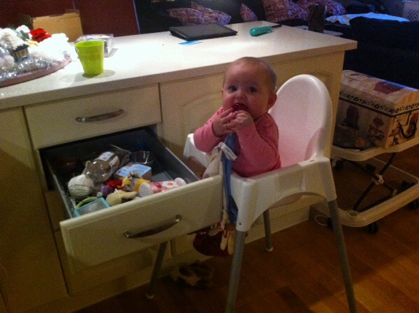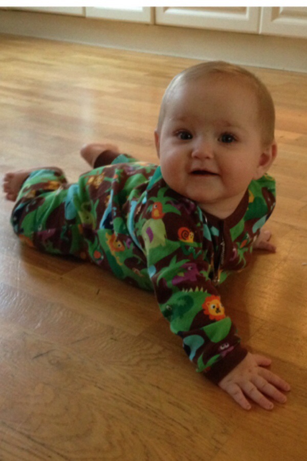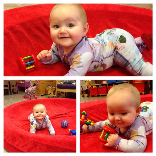 Sannas nya intresse har inte falnat, hon har sytt en jättefin lekmadrass med tillhörande korvkudde till dig, och den tillbringar du mycket tid på, tillsammans med din leksaker. Du älskar det. Du sitter och jollrar, pillar och plockar, lägger dig ner på rygg, på sidan, vänder dig från ryggläge till mage. Det verkar som du försöker hasa dig bakåt, snart börjar du nog krypa baklänges.