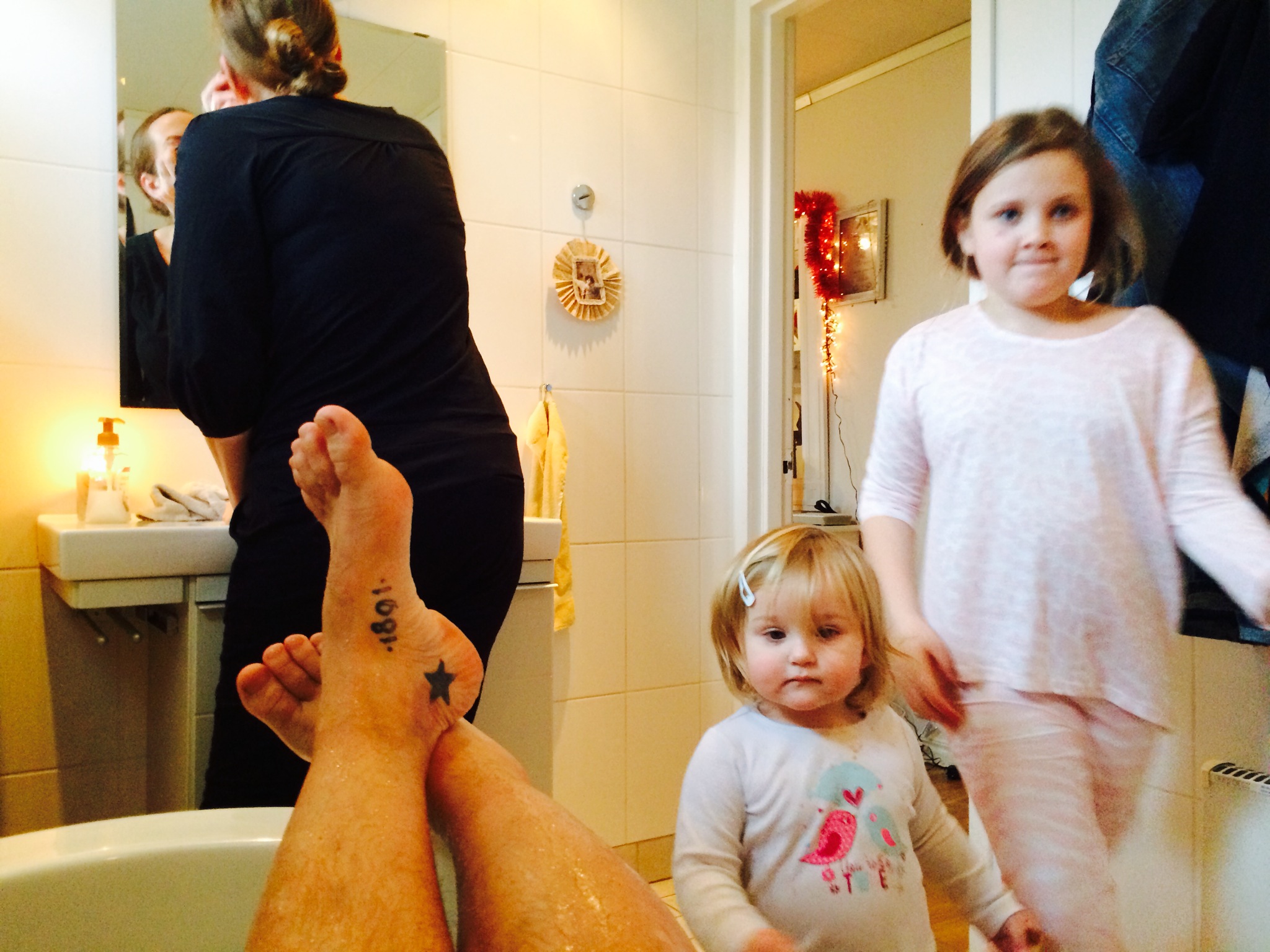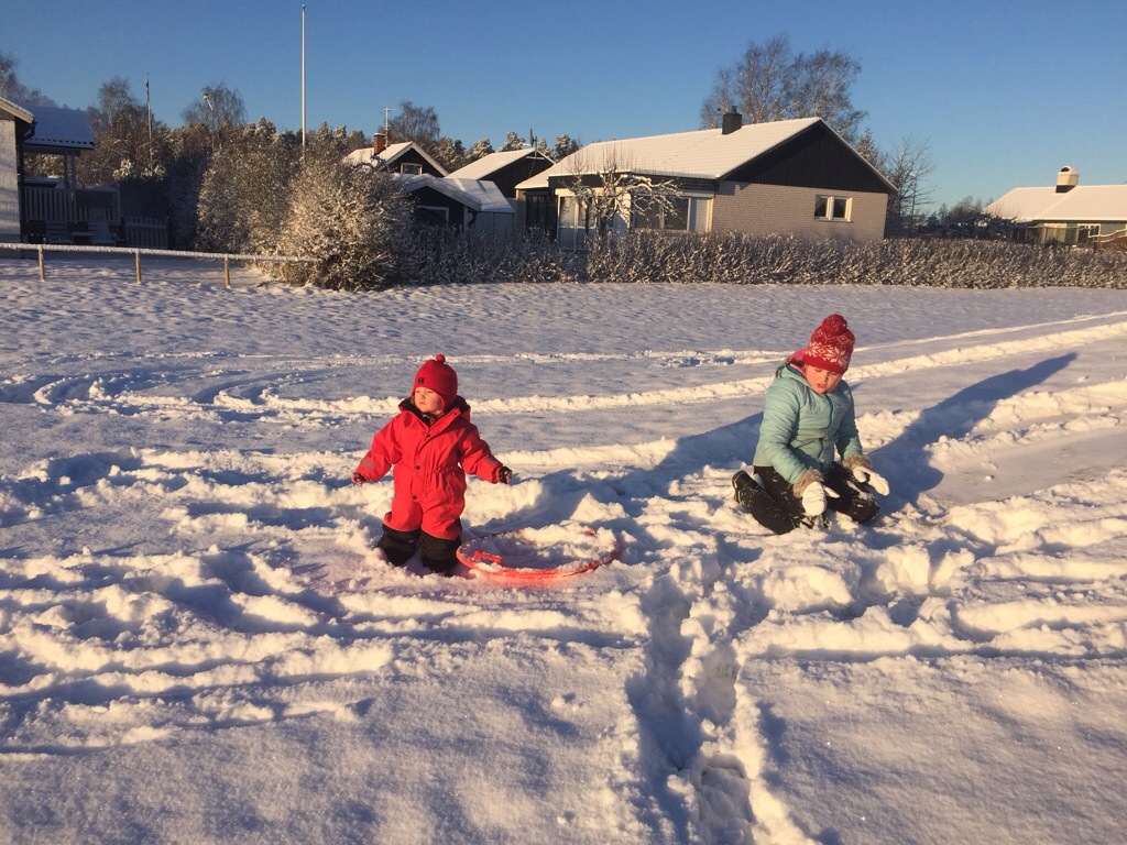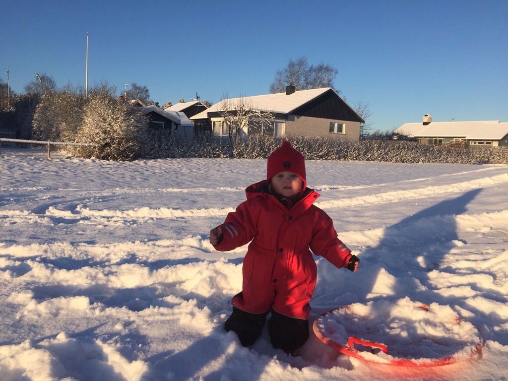 27 december kom äntligen snön. Milla är överlycklig. Tillsammans med alla andra barn. Även lilla du. Solen skiner, en decimeter snö, och det gnistrande landskapet är som gjort för lek. Milla tog med dig ut till kullen i parken bakom huset, på förmiddagen, och åkte pulka. Men du vägrade ha vantar på dig, så det blev lite kallt om händerna efter ett tag. Sen lämnade hon bara av dig och stack i väg med grannbarnen till stora pulkabacken. Härligt. Nu kom hon nyss hem med lilla Ebba. De sitter här och spelar tv-spel och dricker varm choklad. Och du sover. Som alltid när jag skriver. Men det är i stort sett enda tiden jag har när jag får vara lite ifred. Förut hade jag badkaret, men det sket sig ju, för nu har alla lärt sig att öppna utifrån.
