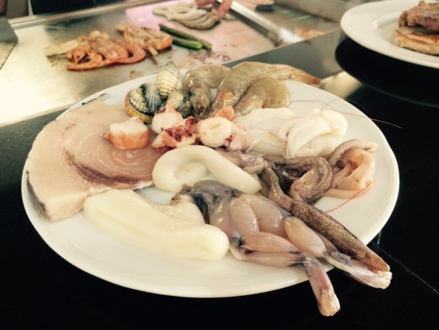 I övrigt har vi ätit helt makalös mat hela veckan. Vi började med en buffé där det fanns allt från havet, massor olika sorters bläckfiskar, fisk, musslor, men även allt tänkbart kött, till och med grodor. Man plockade bara på vad man ville ha och lämnade till kocken som lagade till det framför ögonen. Sedan åt man, hämtade mer, och åt igen. Om och om igen. Allt för en ynka 9€ (typ 90 svenska bagare). Jag avslutade med sushi och efterrätterna. Jag sa det förut, och säger det igen: Makalöst! Dit ska vi i kväll också. Sista chansen.