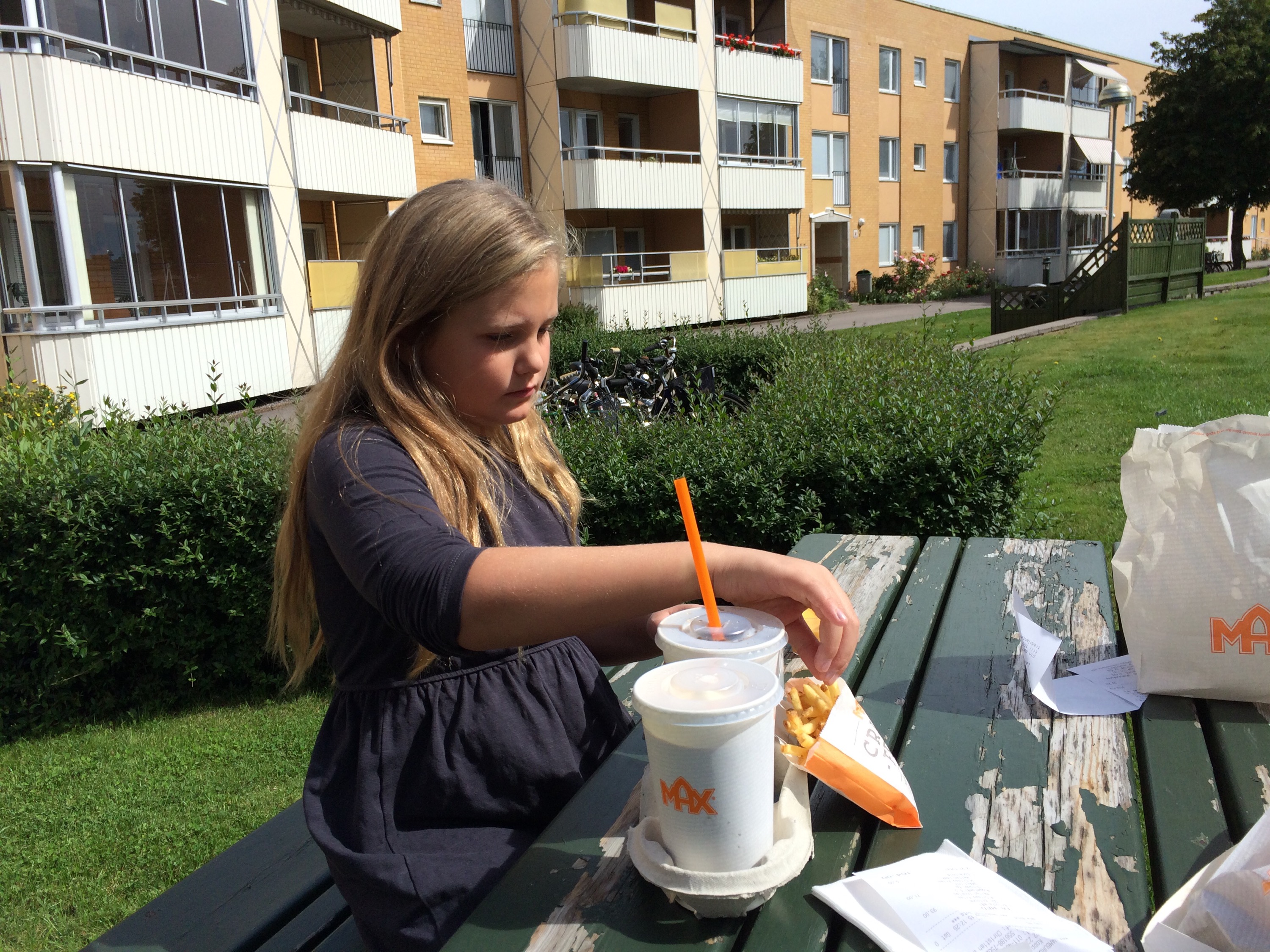 Igår fyllde Milla 10 år. Sommarlovets sista dag. Solsken. Både på himlen och i våra sinnen. Familjen var här. Hundar och ungar, och mor- o farföräldrar. Vi satt ute, fikade, på kvällen åt vi sushi. Ni badade. Ebba och Elsa, Milla och du. (Tänkte skriva om dig och sommaren 2015 i ett eget inlägg senare, just nu är det Milla i fokus. Okej?). Hon fick en actionkamera av Morfar Stig som man kunde filma med under vattnet, så det gjorde ni. Lyckan var total. (Tills den pajade, men jag har bytt den mot en hel idag). Hon fick även en ny cykel av oss och Mormor Katarina, och Morfar Anders. En efterlängtad BMX. Stålgrå med lila detaljer. Oliver tog med henne ut på en cykeltur bort till hennes gamla skola, sent i går kväll. Hon var så lycklig.