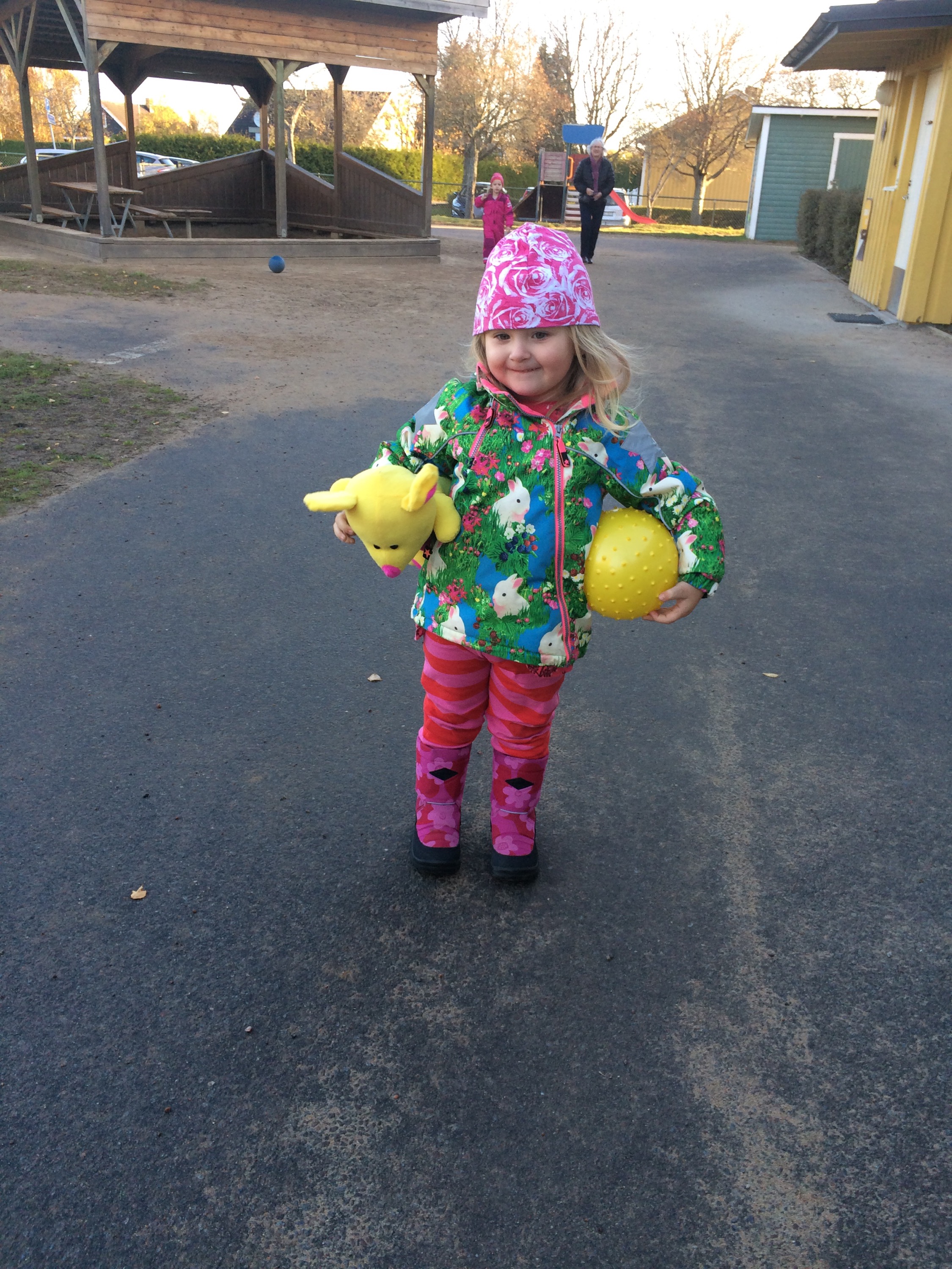 Det har varit en tuff månad med dagislämningen. Jag sa någongång att vi blivit bortskämda, men även att jag visste att det skulle komma ändras. Det gjorde med råge. Gråt, gråt, gråt. Men så helt plötsligt i slutet av förra veckan var du som vanligt igen. Skitglad, traskade in som om du ägde stället, glömde mig, så att jag fick gå mot bilen med en känsla av att ha blivit dumpad. Vet inte vilket som är att föredra. Jo, att du är glad naturligtvis. Tror att det som fick dig att bli glad igen var att du fick ta med dig en ny nalle och visa för Sebbe, Alvin, och Meja i fredags. Imorse räckte det inte med nallen. Bollen med. Går det i den här takten får jag nog hänga på släpvagnen i slutet av veckan.