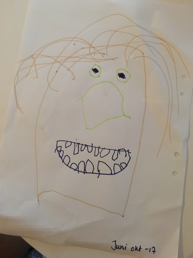Jag må var lätt partisk här, men jag tycker ärligt att du är helt fenomenal på att teckna. Vet inte riktigt var utvecklingsnivån ska ligga, men en 4-åring som ritar mun med tänder och ögon med pupiller?