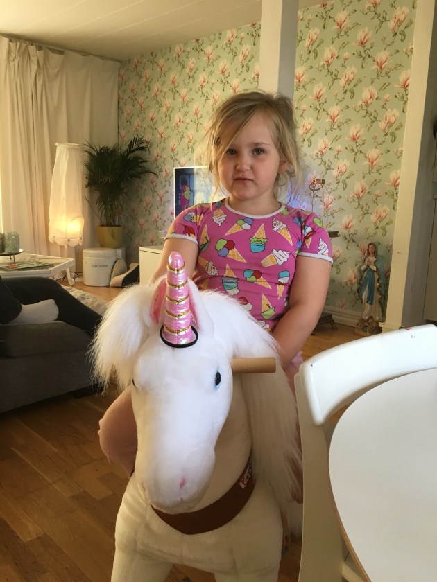 Du har fyllt fem år också sedan sist. Du fick en stor enhörning som man kan rida på. Sen fick du en ny cykel också eftersom du växt ur den andra, fast det var väl ingen födelsedagspresent utan mer en konsekvens av att du envisas med att expandera. Den nya har inte stödhjul men det var inga problem. Du kunde ju redan cykla av någon märklig anledning.