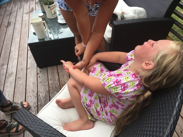 Hos Johan & Anna. Du grät rejält första halvtimman, men sedan var det lungt. Det svullnade inte märkbart heller, så du är inte överkänslig. Det tackar vi för.