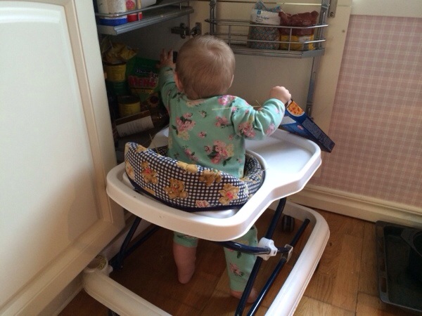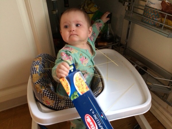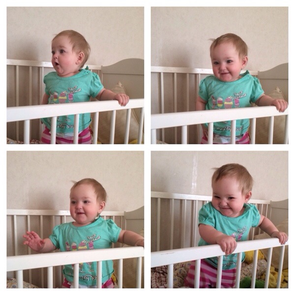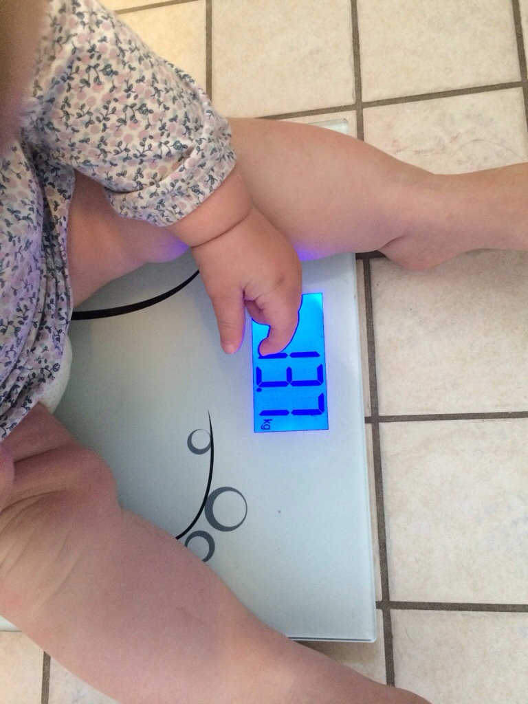 Just nu sitter du och leker med dina leksaker framför mig på golvet. Det är bara du och jag hemma, din Mamma och Milla är och fixar lite nya kläder, och Oliver är i skateladan och åker Skateboard. Du pillar, plockar och pratar. Du har börjat med lite nya grejer, som att peka på saker, och hör du ordet ”nej” så ler du och skakar på huvudet. Det går att tyda några ord nu i jollret, de jag kommer på är: ”Mamma”, ”Pappa”, Katt”, ”Hej”, ”Titta”.