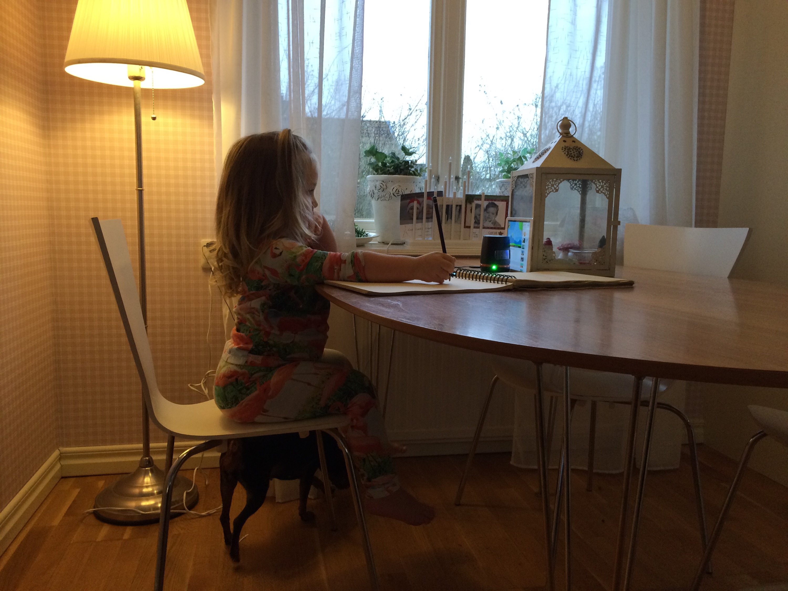 Hej Älskling. Det är söndag den 24 April, tre dagar innan din brors 19-årsdag, och bara en månad innan han tar studenten. Din mamma är på kurs i Stockholm. Botox. Du, Milla och eran kusin Ebba står här bakom mig i köket och bakar (lagar, skapar, tillverkar?) maränger.